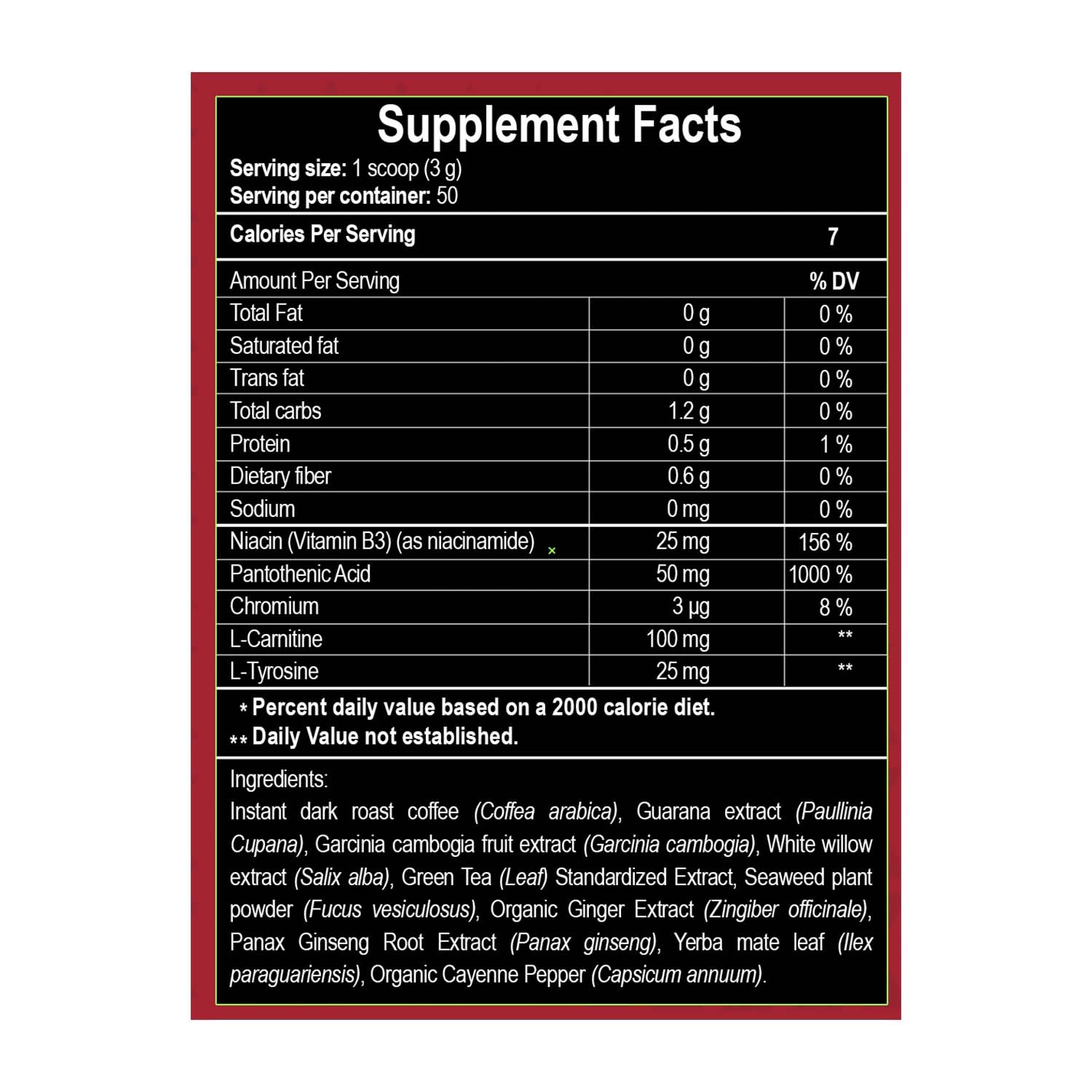 Café tostado oscuro instantáneo (Coffea arabica), Extracto de guaraná (Paullinia cupana), Extracto de sauce blanco (Salix alba), Extracto estandarizado de té verde (hoja), Planta de alga marina en polvo (Fucus vesiculosus), Extracto de jengibre ecológico (Zingiber officinale), Extracto de raíz de Panax ginseng (Panax ginseng), Hoja de yerba mate (Ilex paraguariensis), Pimienta de cayena ecológica (Capsicum annuum).